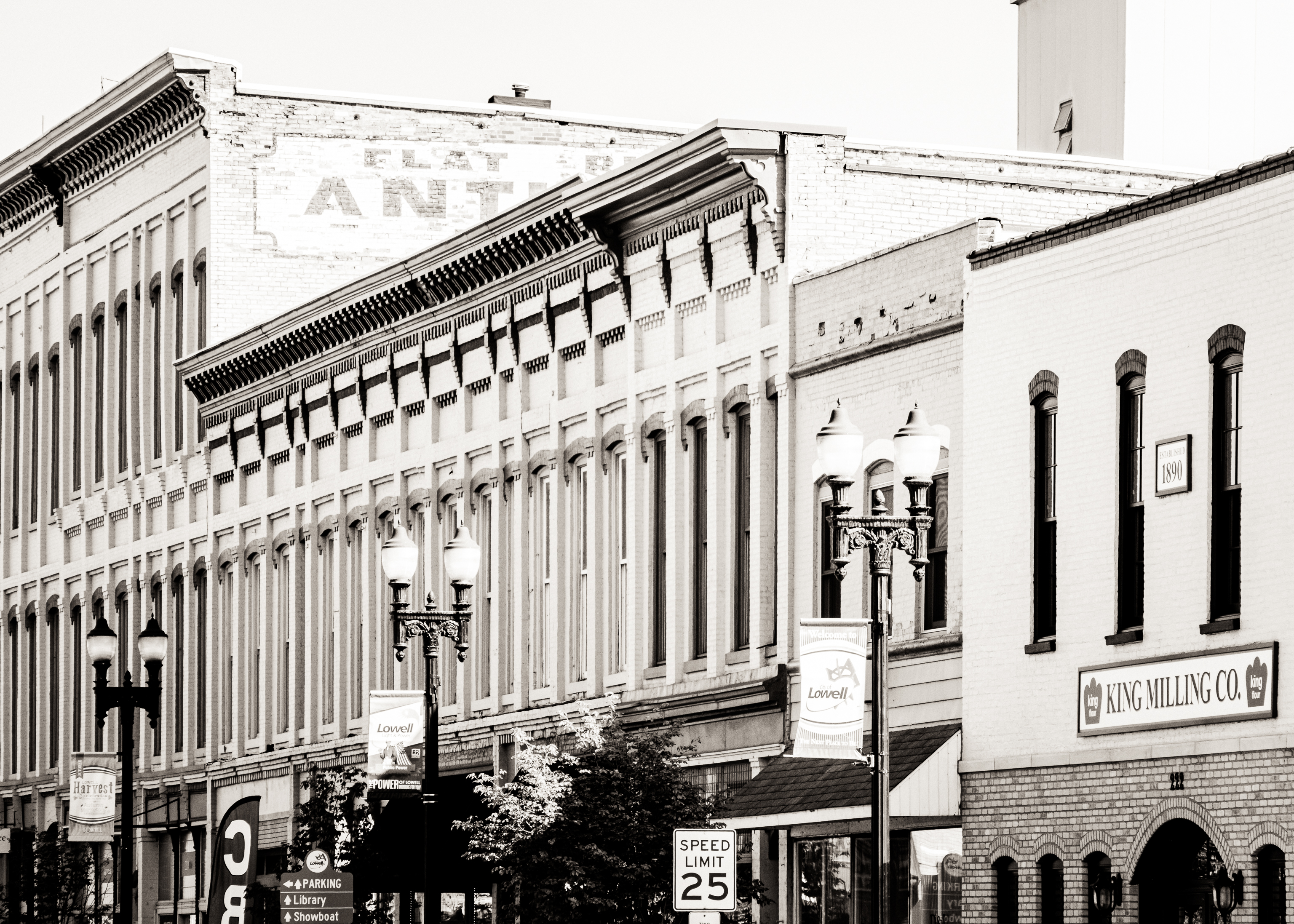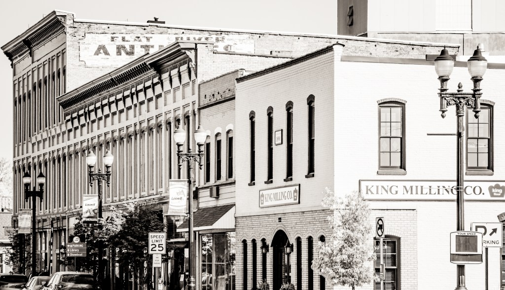 I had a busy Saturday, so I did not get to spend a lot of time photographing. But, while running some errands, I swung by Lowell, Michigan, and spent some time photographing in the business district. I’ve photographed there several times before, so I wanted to find something new. The paired photos below are two new things. The first image is a hallway in Hiemenga Hall, a classroom building at Calvin University. [As always, click on the images to see larger versions.]