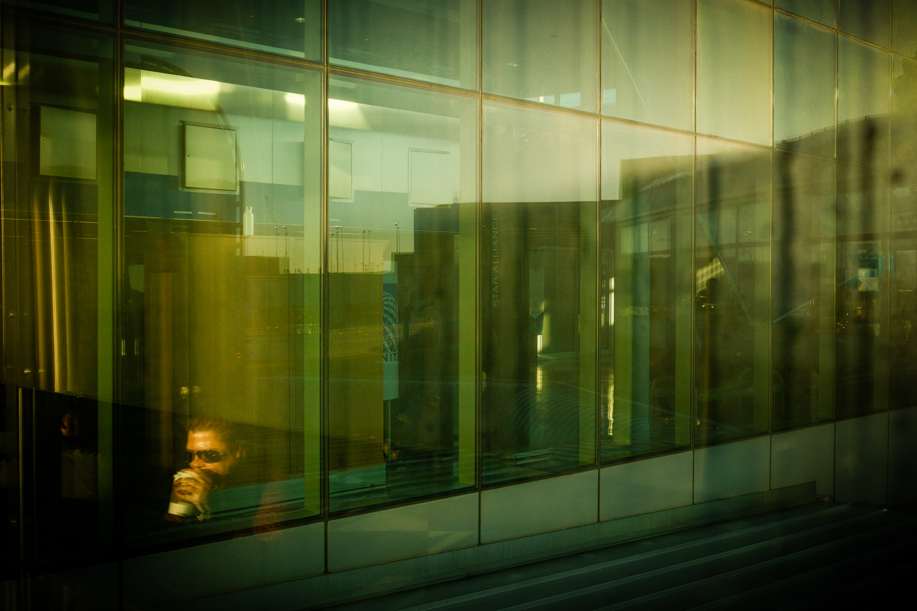 The next three are more abstract. Rather than people walking through the scenes, it is their shadow-like reflections or the way a window frames a reflected image of a person. In the first two, they look ghost-like and seem to be walking in the air. In the last, my favorite of the O’Hare images, I was about to give up. The windows and reflections were not quite enough to make an interesting photo. Then the person with coffee sat down, his reflection appearing in the corner of the series of windows. Perfect!