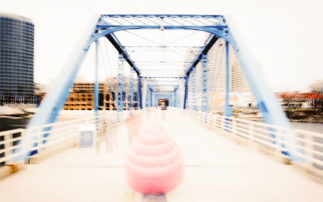 Finally, as I walked back to my car, near the Ford Presidential Museum, I encountered some peace and quiet and quick did this image of the Blue Bridge. It’s a bit “ho-hum.” The red thing at the bottom center may look sort of a like a knit hat. It’s actually some sort of art on the walkway entrance to the bridge.