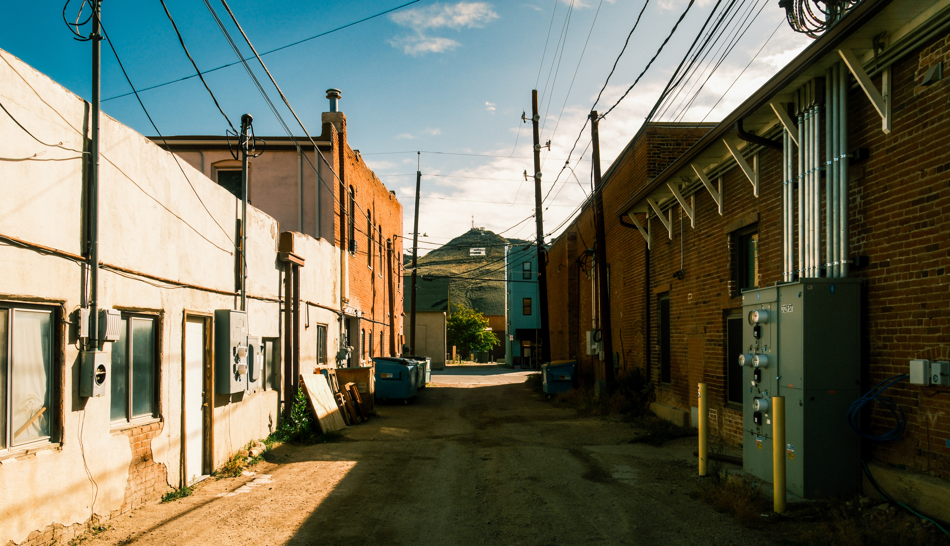 Here are two from Salida. The first is a building that is a work of art in itself, with newer and worn out signs. The second is an alleyway, a feature of many older towns in Colorado. I liked how the alleyway leads you to the hill with the “S” for Salida.