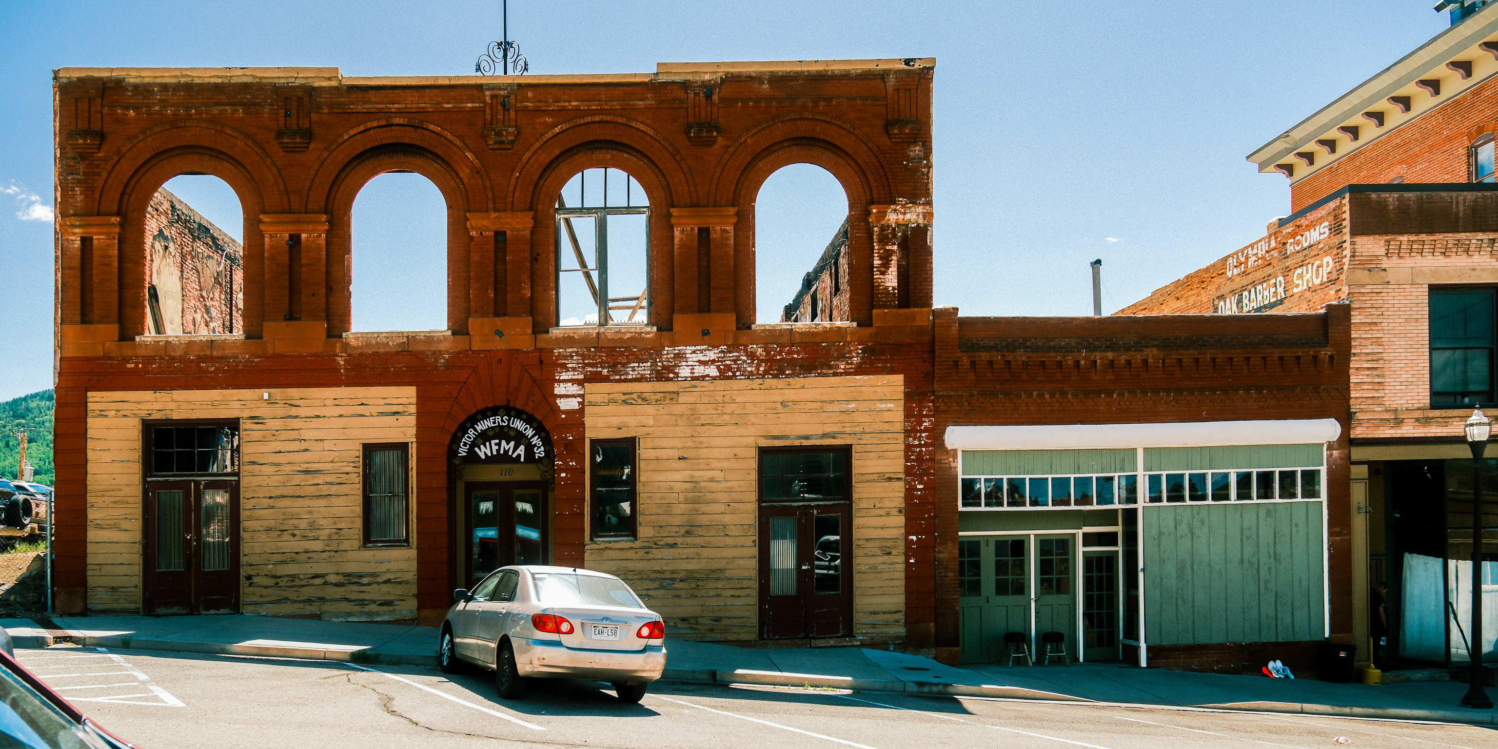 One is an old Western Federation of Miners building; the WFM was a radical labor union that played a major role in the Colorado labor wars. The second image is this group has an example of a lodge (the building with the triangle features in the roof line).